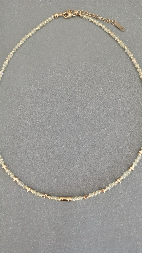 Gargantilla de espinela verde agua, hematites dorados y detalle central en Goldfilled